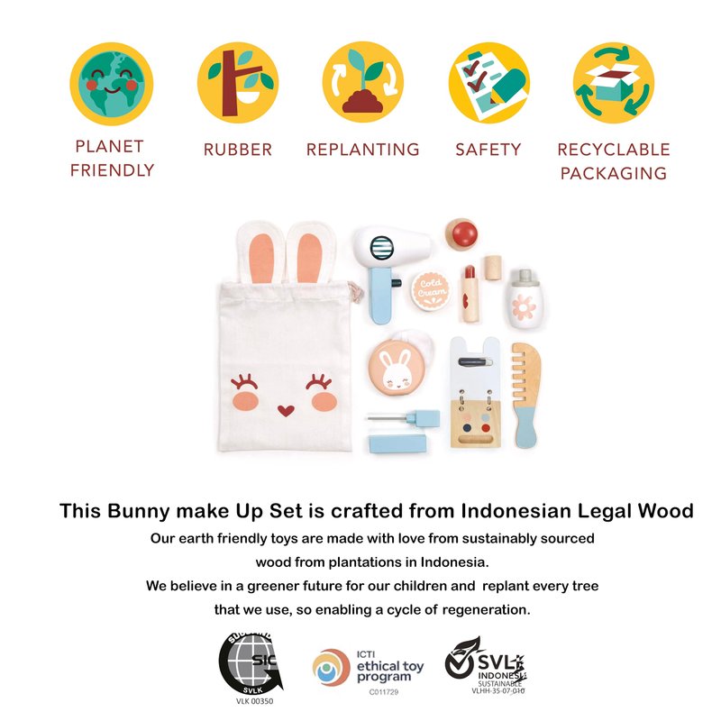 Mentari Toys - Bunny Make Up Set - 10 Pc Wooden Pretend Play Beauty Kit with Bunny Storage Bag - Role Play Toy with Realistic Pieces - Inspire Creativity and Imagination - Age 3+