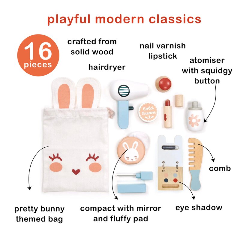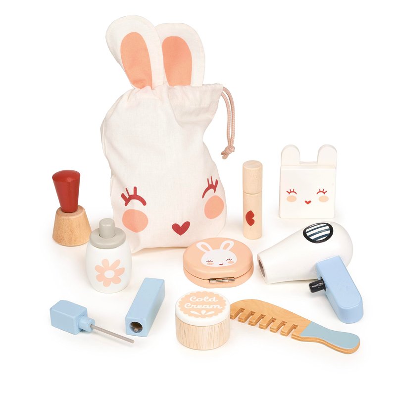 - REALISTIC PIECES - The set contains lipstick, nail varnish, cream pot, comb, hair dryer, mascara, eye shadow pallet, perfume bottle, and a powder puff with a mirror. All pieces pack neatly away in the bunny bag. Product dimensions 7.87 x 2.95 x 9.84 inches.