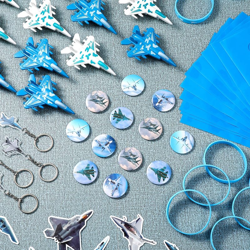 Meooeck 110 Pcs Airplane Party Decorations Fighter Jet Birthday Party Supplies with 12 Airplane Toys, 12 Silicone Bracelets, 12 Button Pins, 12 Keychains, 12 Bags, 50 Sticker for Airplane Party Favor