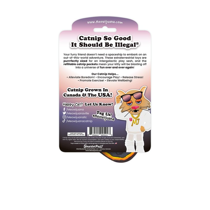 Your furry friend doesn't need a spaceship to embark on an out-of-this-world adventure with the Meowijuana Get Spacey Comet & Planet 2 Pack Toy! These extraterrestrial toys are perfectly sized for an intergalactic play session, making them the ultimate addition to your kitty's toy collection. Each toy features a refillable pocket for our premium, North American-grown organic Meowijuana catnip, ensuring your kitty will be blasting off into a universe of fun over and over again. Designed for durability, these toys can withstand even the most enthusiastic feline play sessions, providing endless entertainment and mental stimulation. The vibrant colors and engaging textures will captivate your cat's attention, turning playtime into an exciting space adventure. Watch your furry friend bat, pounce, and cuddle with these delightful comet and planet toys, enjoying the irresistible allure of our top-shelf catnip. Let your kitty explore the cosmos and enjoy endless galactic joy with these captivating, catnip-infused toys!