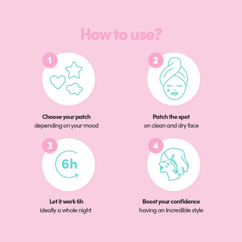 How to use it: 1. Choose the patch that best matches the button you target. We have 3 patch sizes (small, medium and large) and 3 shapes (star, heart or cloud) depending on the mood of the day. 2. Apply it to your button, with clean hands and clean face (you can use our front cleaning stick for example) 3. Let it act at least 6h, ideally all night to have a superb result. 4. Peel it off with clean hands. So incredible right?