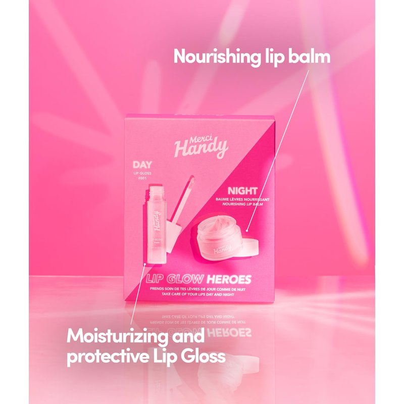 Merci Handy - Lip Glow Heroes - Lip Gloss (0.13 fl oz) - Nourishing Lip Balm (10 g) - Moisturizer - 97% natural ingredients - Day and Night Lip Care Kit - Soft Lips