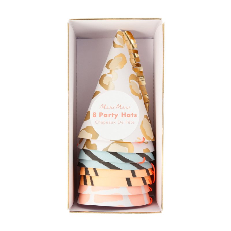 If you're holding a safari-themed party, you will love these sensational Safari Animal Print party hats. Featuring different colored designs with gorgeous gold foil details and gold foil fringing, to make your guests look amazing! Neon elastic. Gold fringe. Neon print & gold foil detail. Pack of 8 in 4 designs. Product dimensions: 3.25 x 4.5 x 3.25 inches