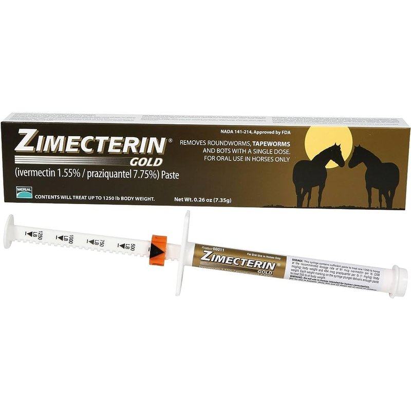 Zimecterin Gold (ivermectin/praziquantel) Paste provides effective treatment and control of the following parasites in horses. Tapeworms-Anoplocephala perfoliata, Large Strongyles (adults)-Strongylus vulgaris (also early forms in blood vessels), S. edentatus (also tissue stages), S. equinus, Triodontophorus spp. including T. brevicauda and T. serratus and Craterostomum acuticaudatum; Small Strongyles (adults, including those resistant to some benzimidazole class compounds)-Coronocyclus spp. including C. coronatus, C. labiatus and C. labratus, Cyathostomum spp. including C. catinatum and C. pateratum, Cylicocyclus spp. including C. insigne, C. leptostomum, C. nassatus and C. brevicapsulatus, Cylicodontophorus spp., Cylicostephanus spp., including C. calicatus, C. goldi, C. longibursatus and C. minutus and Petrovinema poculatum; Small Strongyles-Fourth-stage larvae; Pinworms (adults and fourth-stage larvae)-Oxyuris equi; Ascarids (adults and third-and fourth-stage larvae)-Parascaris equorum; Hairworms (adults)-Trichostrongylus axei; Large-mouth Stomach Worms (adults)-Habronema muscae; Bots (oral and gastric stages)-Gasterophilus spp. including G. intestinalis and G. nasalis; Lungworms (adults and fourth-stage larvae)-Dictyocaulus arnfieldi; Intestinal Threadworms (adults)-Strongyloides westeri; Summer Sores caused by Habronema and Draschia spp. cutaneous third-stage larvae; Dermatitis caused by neck threadworm microfilariae, Onchocerca sp.