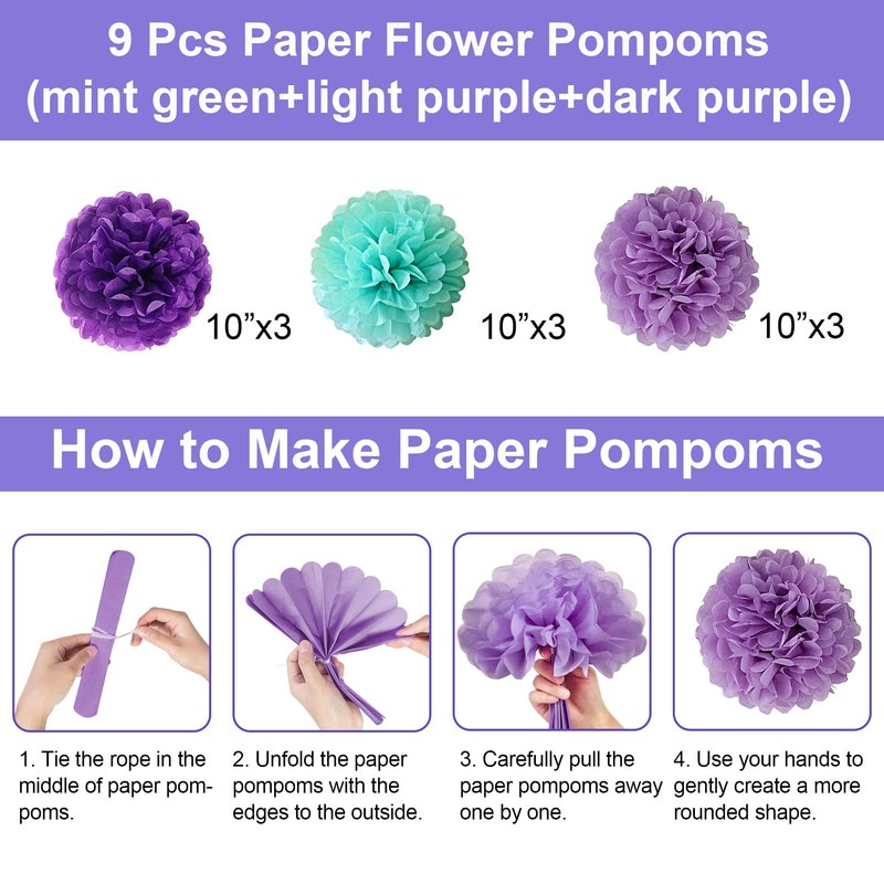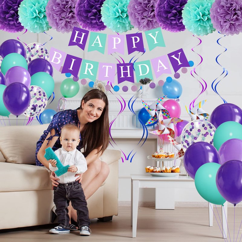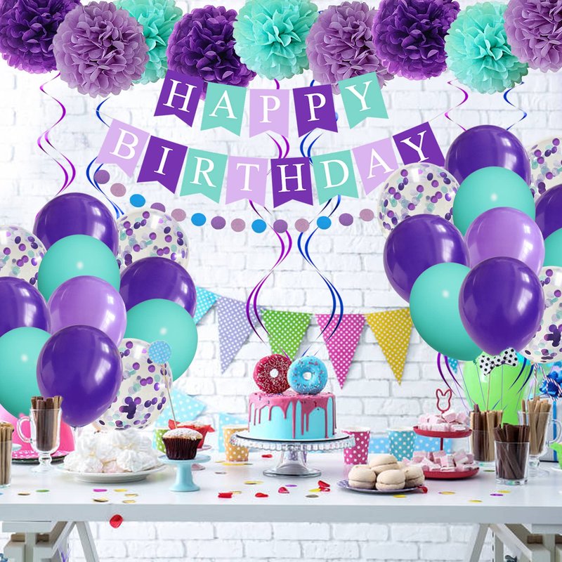 - Mermaid Birthday Party Decorations - The mermaid decorations are designed in colors which includes: 9 pcs 10" paper flower pompoms in 3 colors (3 blue/3 light purplr/3 dark purple), 1 mermaid happy birthday banner, 8 pcs 12'' confetti balloons, 24 pcs 12'' latex balloons(8 teal/8 light purple/8 dark purple), 6 pcs hanging spirals(3 purple/3 blue), 1 string glittery circle dots garland, 100 glue points, 2 pcs 10m ribbon & 1tying tool, meet all your needs in one package.