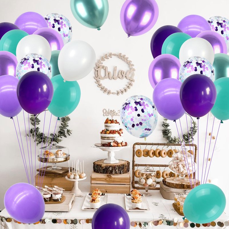 - Purple Green Birthday Balloons: This purple green balloons set includes 60PCS 12-inch latex party balloons, comprising 8* black purple balloons, 12* purple balloons, 12* teal blue balloons, 6* metallic green balloons, 6* metallic purple balloons, 12* white balloons, 6* blue purple confetti balloons, 2*ribbon. With these beautiful balloons, your birthday party will stand out and hold more meaning.