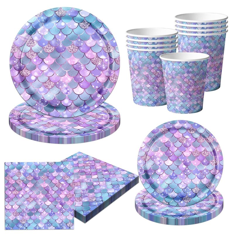 - 💜【MERMAID BIRTHDAY DECORATIONS】Happy mermaid theme birthday party !The mermaid party decorations will meet your party needs.It includes 20pcs 9inch purple mermaid plates,20pcs 7inch mermaid paper plates,20pcs mermaid cups,20pcs mermaid napkins. You can easily create lively party atmosphere, giving your party a very formal and unique feeling.