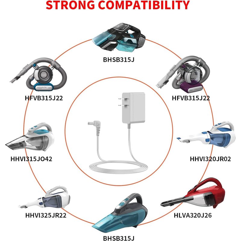 - [Compatibility]Replacement Black & Decker Vacuum Charger part number 90627870 and 90629039. Fit Models: HHVI315JO42, HLVA315J22, HWVI225J21, HWVI225J01, HWVI220J52, HNVB115J10, HNV115J62, HNV115J56, HNV115J21, HNV115J13, HNV115J06, HLWVA325JF21, HLWVA325J21, HLVC320J01, HLVC315J10, HLVB315JP07, HLVB315JCZ01, HLVB315JA26, HLVA325JPS07, HLVA325JP07, HLVA325J10, HLVA320JS10, HLVA320J26 TYPE1 and CA Model