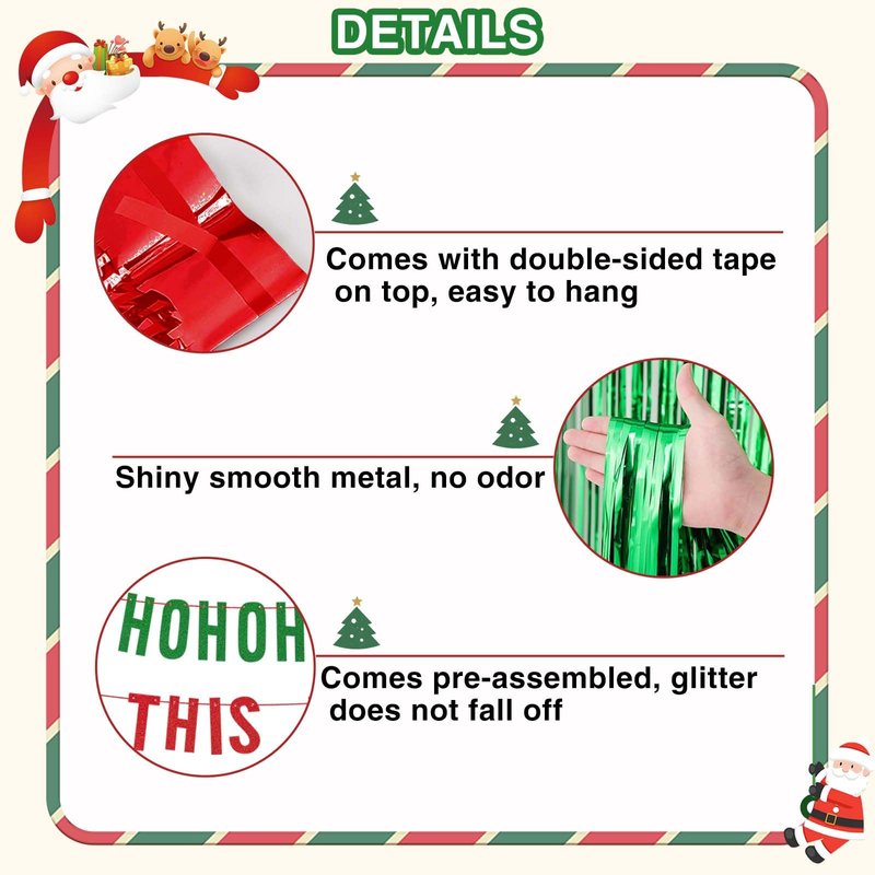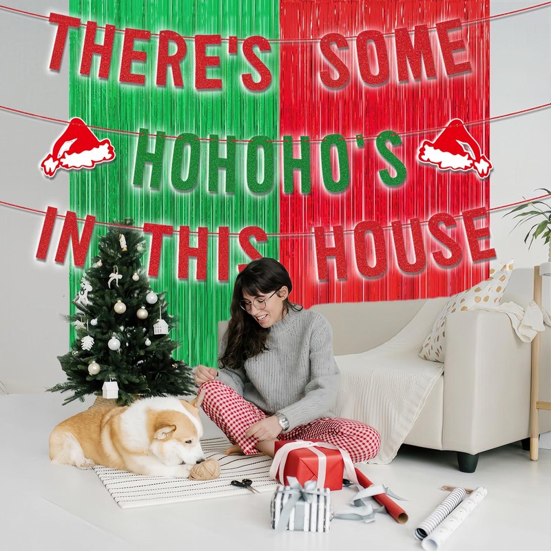 - Package Includes:You will receive 3 pre-strung vintage Merry Christmas signs: 1 glitter red "There's Some" banner, 1 glitter green "Ho Ho Hos" garland, and 1 glitter red "In This House" banner (each string is 2.5 meters with adjustable lettering spacing). Additionally, there is 1 red foil curtain and 1 green foil curtain party streamer. The funny banners and xmas decorations present beautiful colors that make your Christmas party even more joyful.