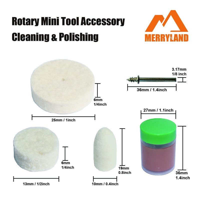 - 【 MULTI SIZE 】 Merryland Flet Polishing Wheel For Dremel RMTA145C1 Contains 145pcs Totally: 1inch ( 25mm ) Polishing Wheel 60pcs, 1/2inch ( 13mm ) Polishing Wheel 60pcs, Polishing Cone 20pcs, Polishing Paste 1pcs, 1/8inch ( 3.17mm ) Diameter Mandrel 4pcs. Designed For Professionals.