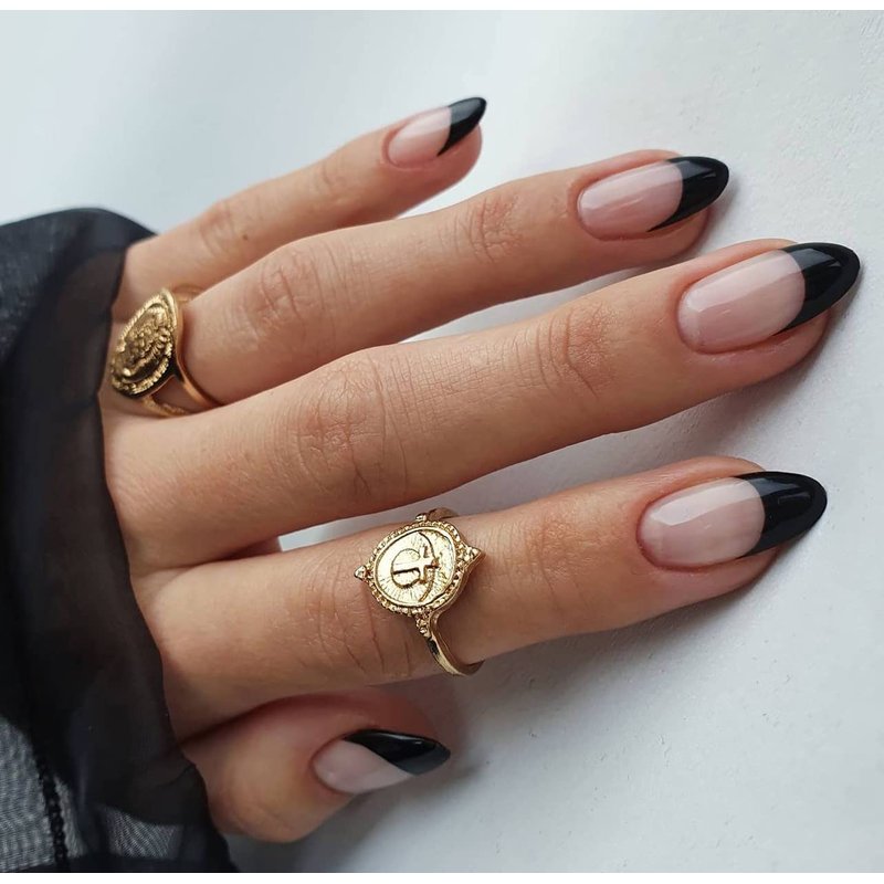 MERVF Almond Press on Nails Medium Black French Tip Fake Nails Glossy Oval Black Glue on False Nails Natural Nails Full Cover Acrylic Nails Press ons