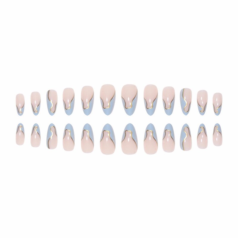 MERVF Almond Press on Nails Medium Fake Nails Blue French Tip Stiletto Acrylic Nails Press ons with Gold Lines Design Glue on Nails 24pcs Glossy