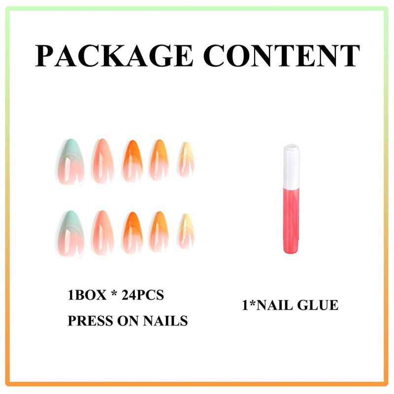 MERVF Medium Press on Nails Almond Fake Nails Ombre French Tip Stiletto Glue on Nails with Colorful Design Glossy 24pcs Acrylic Nails Press ons