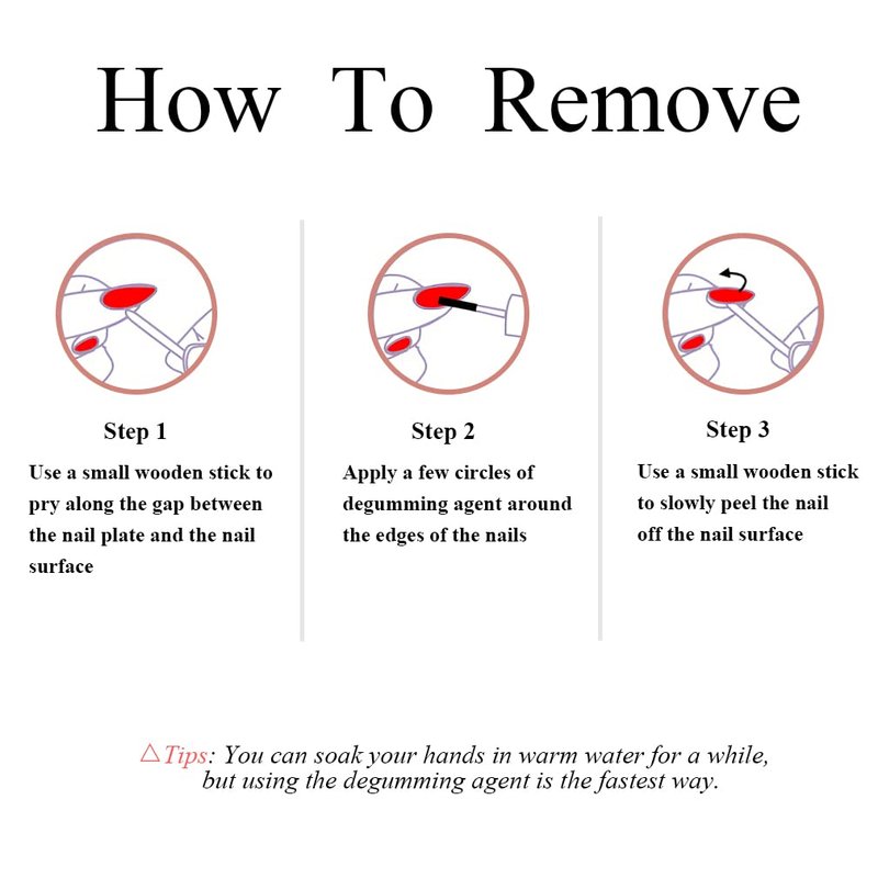 1.Soak your hands in warm water for a while or Apply a few circles of degumming agent around the edges of the nails.