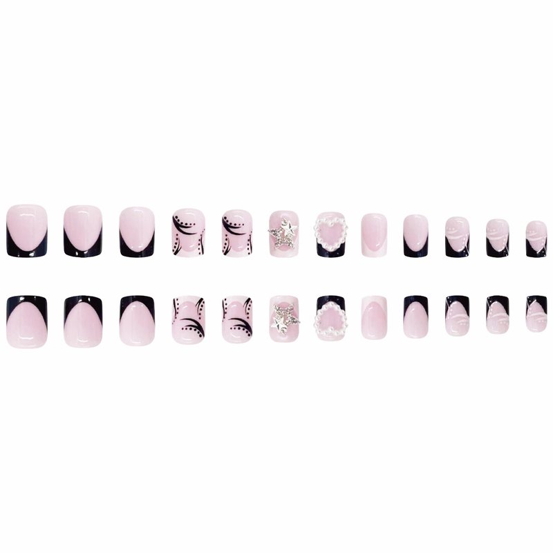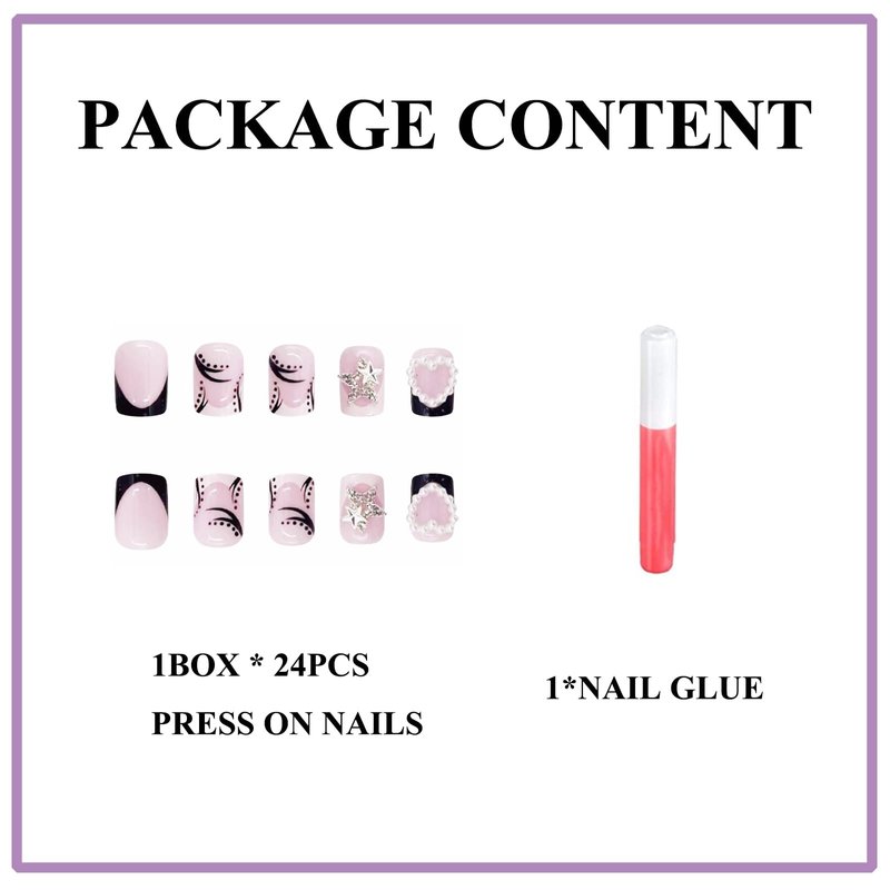 MERVF Short Square Press on Nails French Tip Black Fake Nails with Charms Squoval Glue on Nails Press ons Heart Star Acrylic Nails with Y2K Design 24pcs Glossy