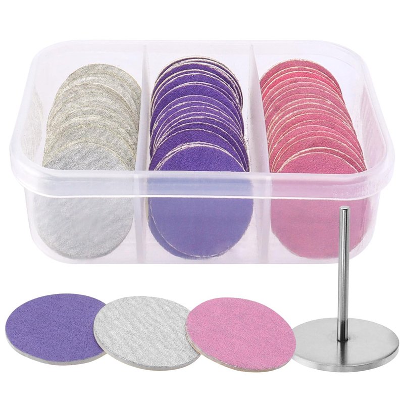 - Nail Sandpaper Discs Kit - 60pcs 180grit foot sanding discs in 3 different colors(Pink/White/Purple), come with 1pc metal shaft disc