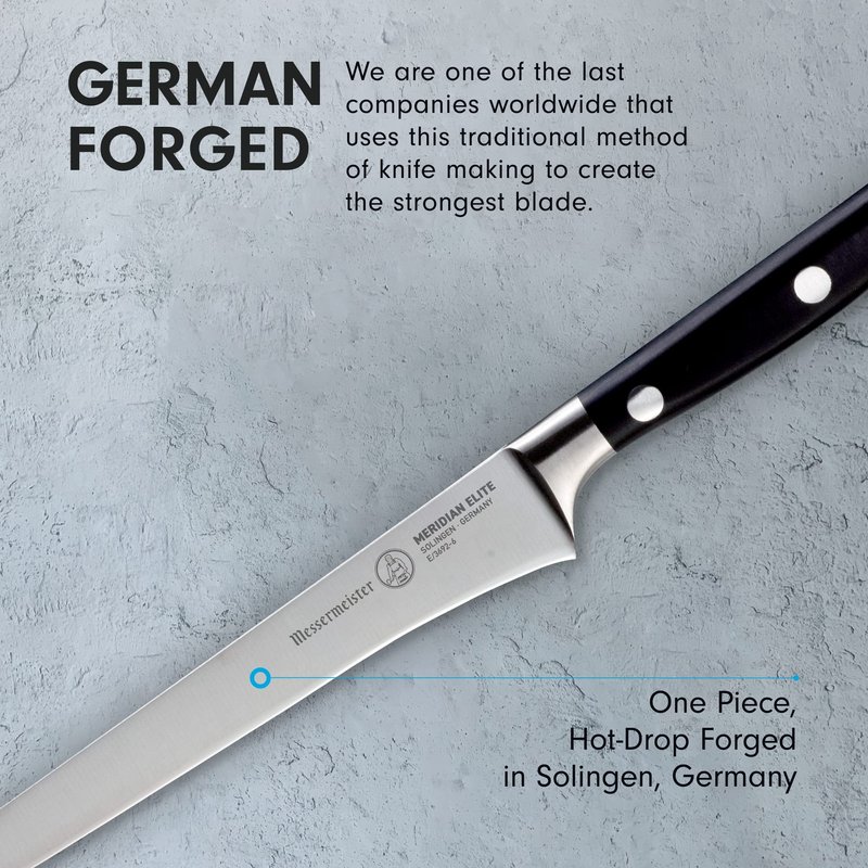 - BONING KNIFE - Meridian Elite knives define tradition with the triple-rivet, full-exposed tang series. Handcrafted in Solingen, Germany, they are one piece, hot-drop hammer forged for a sharper knife with POM handles for comfort and durability.