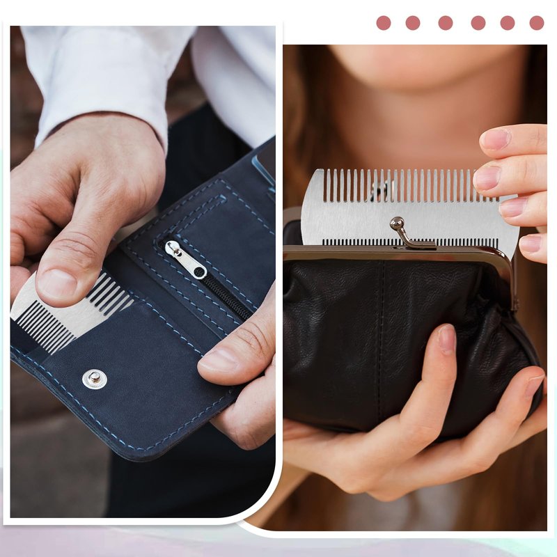 - MINI STAINLESS STEEL COMB - Crafted from durable stainless steel, these silver wallet hair combs are built to last. The polished and smooth surfaces prevent any damage to your hair and scalp.
