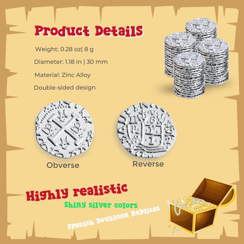 - HEAVY AND BRIGHT - These Spanish Doubloon Replicas are made of zinc alloy, sturdy and resistant, fade, safe and non-toxic, can be kept for a long time. They feature a shiny Silver surface. The exquisite vintage pattern is clearly carved on both sides of the coins.