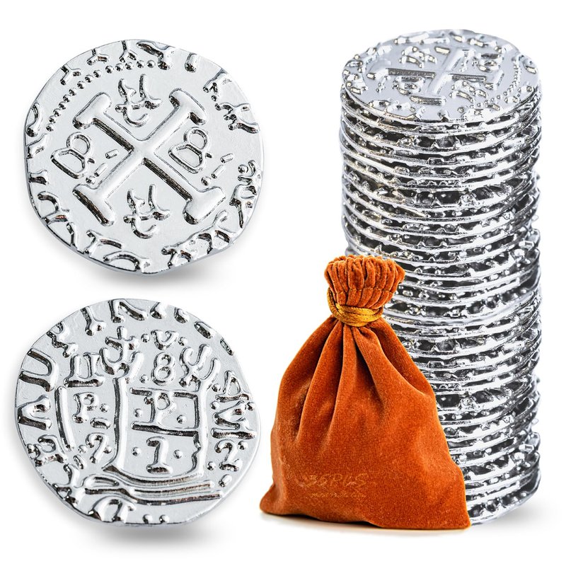 Bring a touch of swashbuckling adventure to your board games, cosplay, and pirate parties with this Silver Treasure Coin Set. These 1.18 inch X Large metal pirate coins are perfect replicas of Spanish doubloons, making them a must-have for any fan of pirate lore.