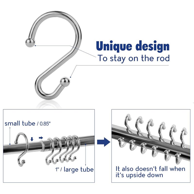 - GOOD DESIGN:Our uniquely designed S-shape, which reduces friction and tearing, slides easily and smoothly on any diameter.The hook end ball is designed to stay on the rod and doesn't fall.