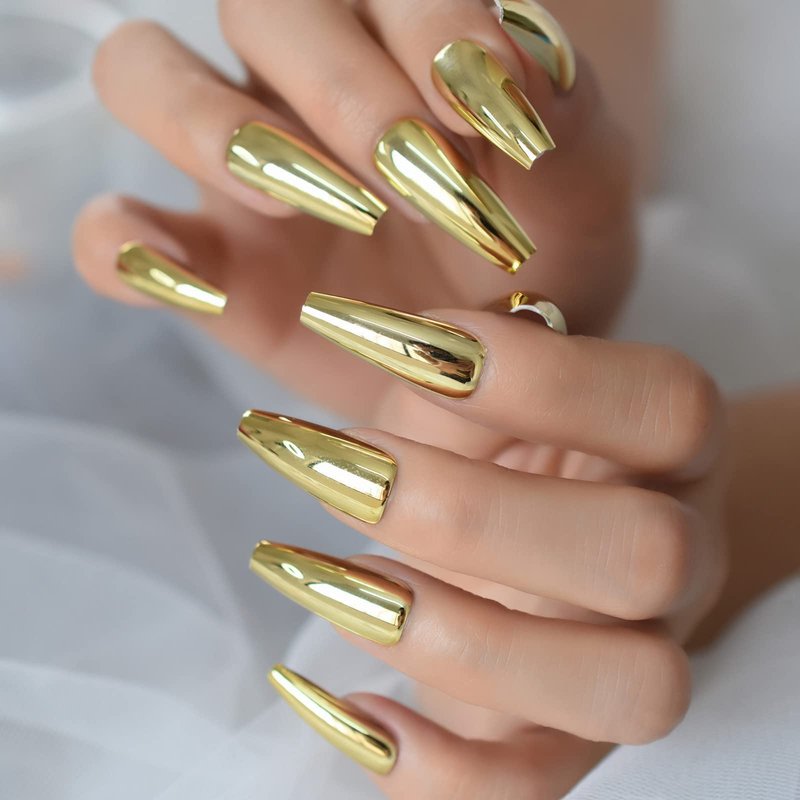 Metallic Coffin Nail Tips Extra Long False Press On Fake Nails Gold Chrome Mirror Punk Rock Full Cover Fingernail Decorations 24pcs/Set