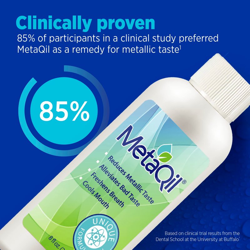 - Alleviate Metallic, Bitter, & Unusual Tastes - MetaQil is an innovative oral rinse that cools the mouth to provide instant relief and comfort for metallic taste symptoms caused by chemotherapy, radiation, COVID-19, medication, or GERD