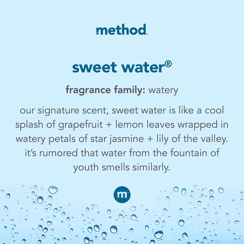 - Sweet Water blends light fragrance notes of grapefruit, dewy lemon leaf, petals of star jasmine + lily of the valley.