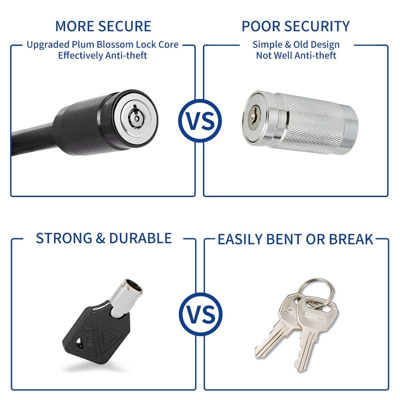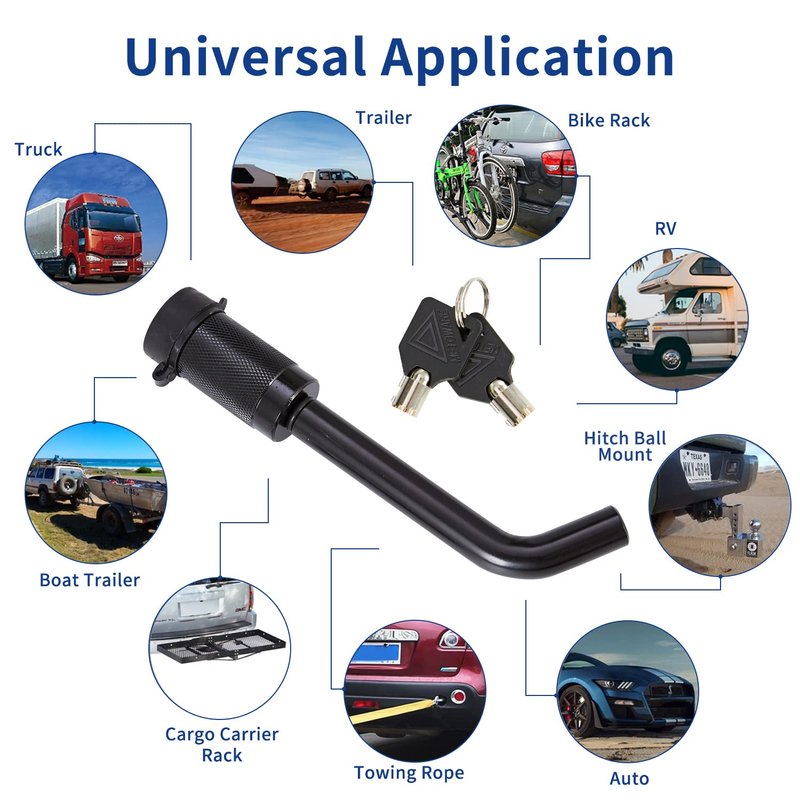 - [SECURITY OF HITCH LOCK] This towing hitch lock is made of black electrophoretic painted solid steel. Our upgraded Zinc alloy tubular lock core adopts more advanced anti-theft technology to improve safety. The pin lock made of heavy-duty steel is durably made and does so without being outrageously heavy.