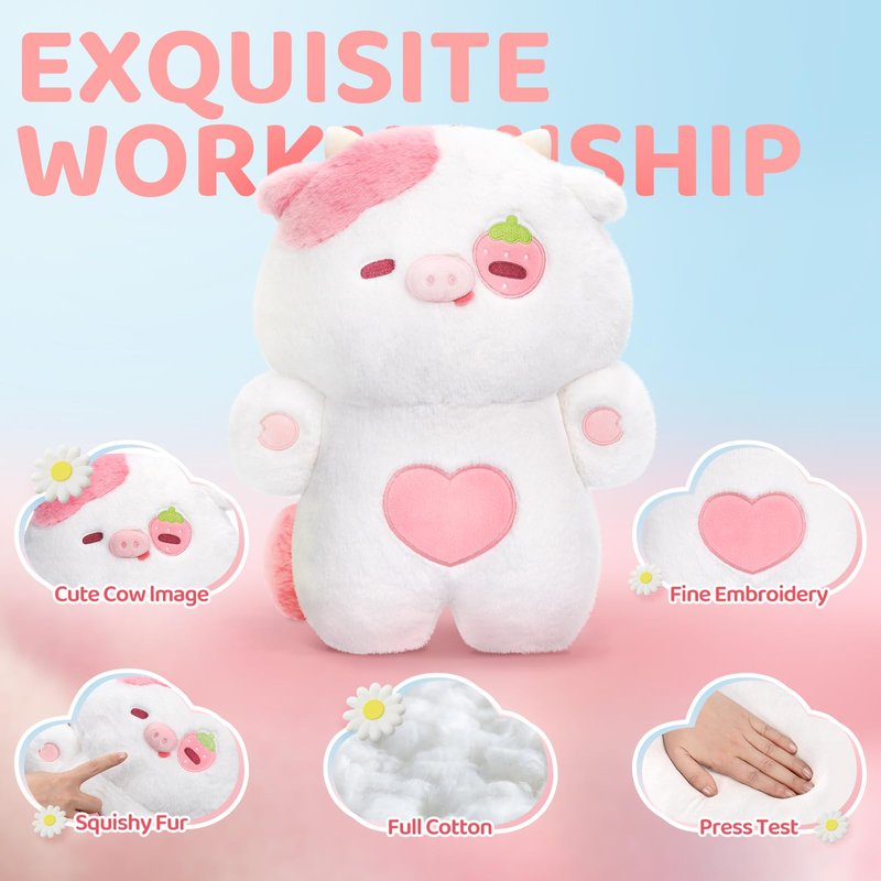 - Strawberry Cow Pillow Cute Design: With its lovely and lifelike cow stuffed animal pillow, a smiling appearance, and soft fabric. All bad emotions and work stress will disappear when you embrace stuffed toys! This cow plush can accompany you or your friends through lonely times.