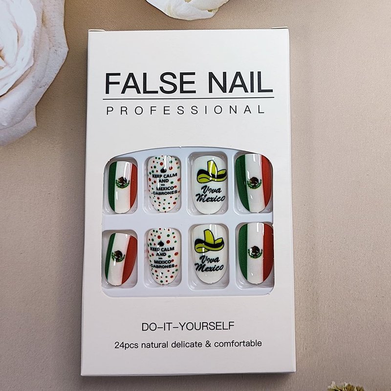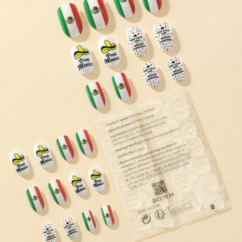 - Package Contents: 24 Pcs Mexico independence day fake nails and jelly glue stickers.(Jelly glue doesn't last as long as liquid glue, but it has the advantage of making the fake nail reusable. So I suggest please use suitable glue according to different scenarios)