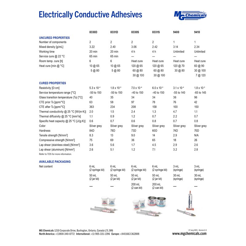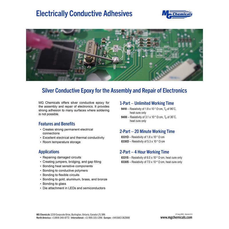 - Two-part silver-filled epoxy adhesive with good conductivity and slower working time than MG Chemicals 8331. Bond electronic devices, form conductivity seals, and cold solder heat-sensitive materials