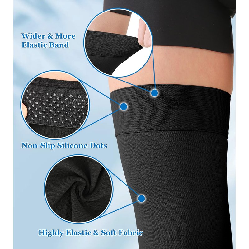 - 20-30 mmHg Graduated Compression: It applies the greatest pressure at the ankle and decreases gradually up the leg to promote healthy circulation and keep you feeling energized. It also helps reduce and prevent swelling for the wearer, able to be effective reduce muscle cramping while re-energizing tired legs and effectively solve the problem of inflammation of the legs and feet, maintaining the leg health. These thigh high leg sleeves will be a tight fit when first worn, it's normal.