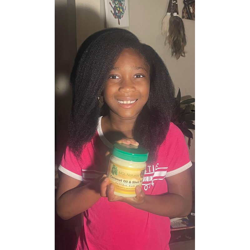 MGL Naturals Coconut Oil and Shea Butter Natural Hair Food made with organic ingredients. Nourish and moisturize hair for growth, softness, shine, manageability and protect against hair damage.