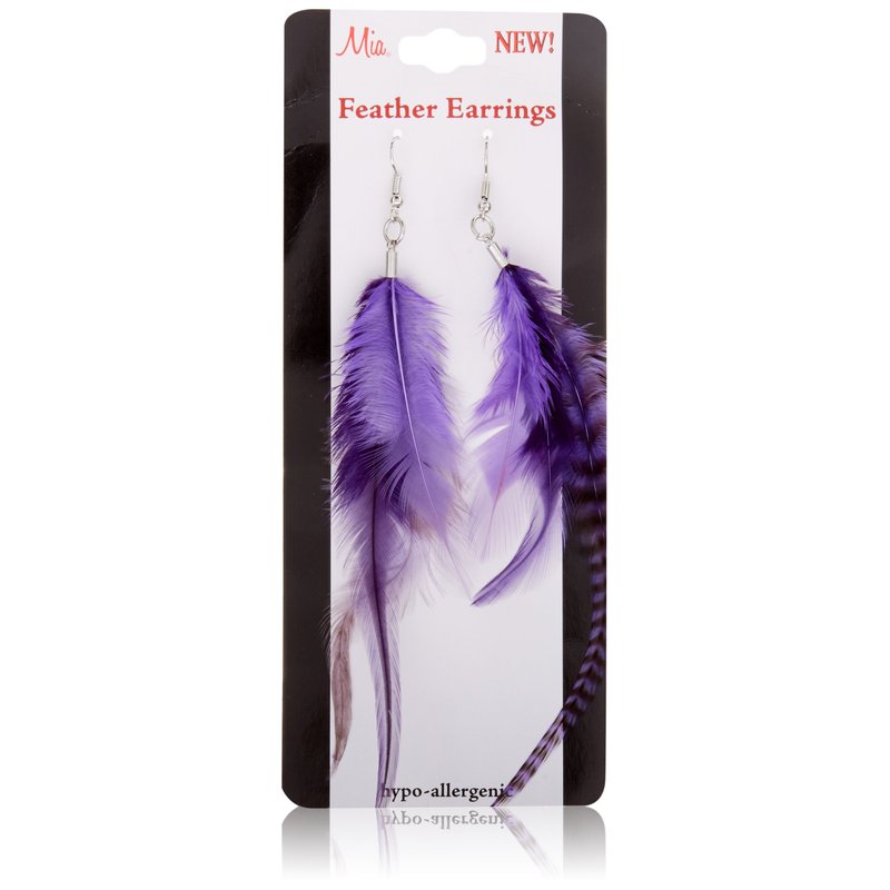 Mia Feather Earrings-Purple Color-3 Natural Feathers Per Earring-Approximately 5" Long-For Pierced Ears (1 set per package)