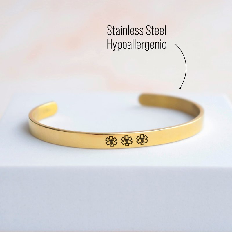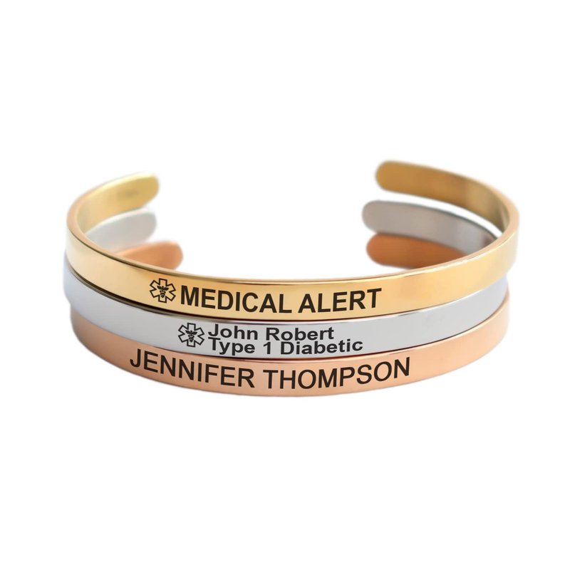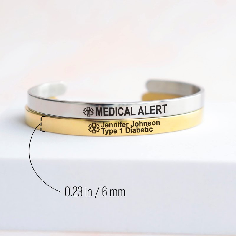 - ITEM DETAILS: This cuff bracelet is 0.23” wide and adjustable to any wrist. It is made with stainless steel so it won’t rust or tarnish. It’s available in silver, gold and rose gold. It is dainty and cute, which is a good option if you are looking for a discreet medical bracelet.