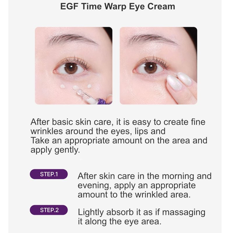 ◆ How to use EGF Time Warp Eye Cream ✔ After basic skin care, it is easy to create fine wrinkles around the eyes, lips and Take an appropriate amount on the area and apply gently. STEP.1 - After skin care in the morning and evening, apply an appropriate amount to the wrinkled area. STEP.2 - Lightly absorb it as if massaging it along the eye area.