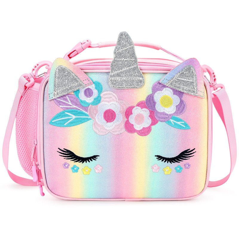 - 【Perfect Gift for Little Girls】This unicorn lunch box for girls comes with a lovely horn and ears, it's a hit and trendy element among little girls. Colorful embroidered flowers and cute eyelashes also add charm, that's so cute and easy for matching to wear with different kinds of backpacks and brings so much fun to your little princess at lunchtime. Perfect gift for your daughter, granddaughter, niece, etc. Your little one will be obsessed with this fashion and practical school partner.