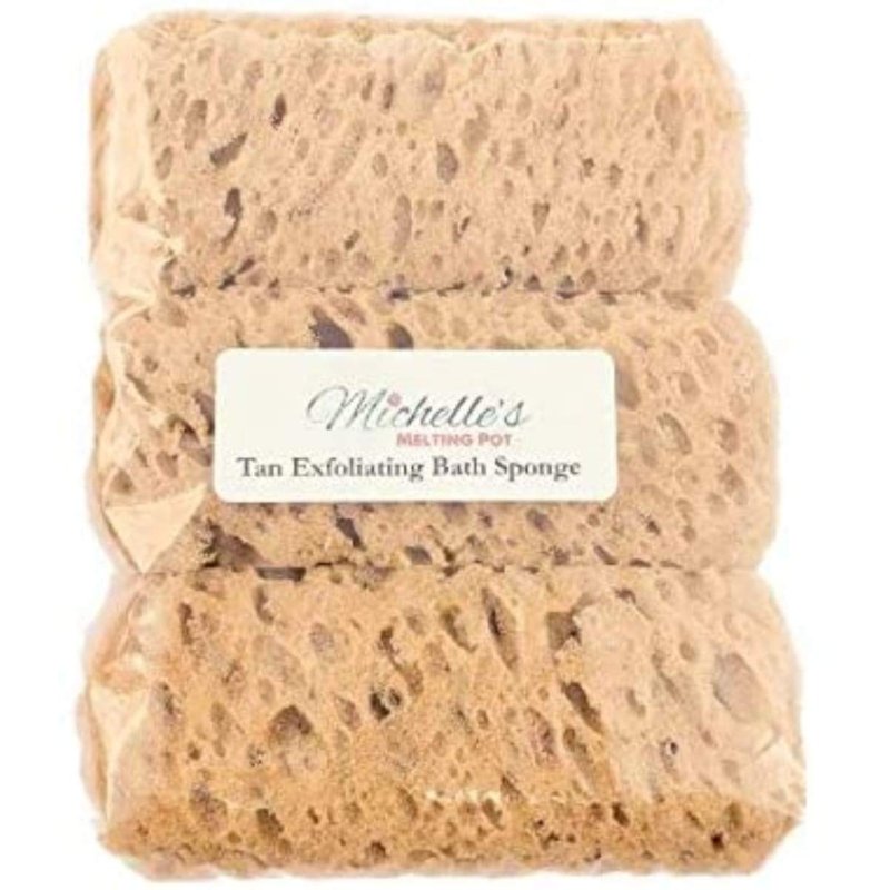Michelle's Melting Pot's Tan Exfoliating Bath Sponge 3 Pack This tan sponge has a coarse texture that exfoliates while cleansing your skin. While it is coarse enough to exfoliate it is still gentle on your skin. The sponge is absorbent and provides a rich, creamy lather while bathing. Sponges should be replaced once a month depending on individual use.