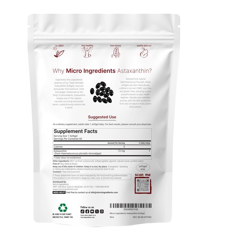 • Micro Ingredients offers extra strength Astaxanthin 12mg softgels, delivering a potent dose of naturally occurring antioxidants* and carotenoids sourced from Haematococcus Pluvialis microalgae.