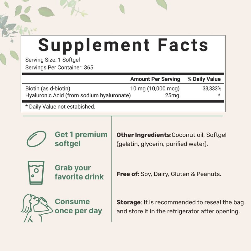 - A powerful once-daily biotin 10000mcg supplement that is derived from premium D-Biotin, as well as containing 25mg hyaluronic acid from sodium hyaluronate. Every pouch offers a full year supply that only takes a single softgel serving size to promote overall confidence, inside and out.