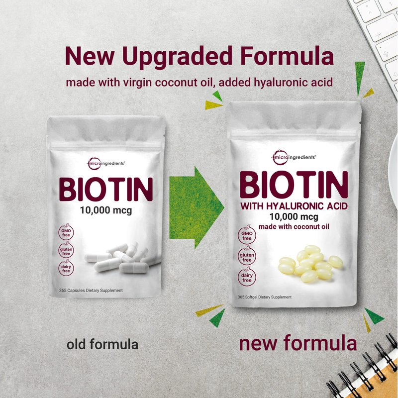 Micro Ingredients Biotin 10,000mcg w/Hyaluronic Acid 25mg | 365 Virgin Coconut Oil Softgels, Fast Release, One Year Supply, Supports Healthy Hair, Skin & Nails, Non-GMO & No Gluten