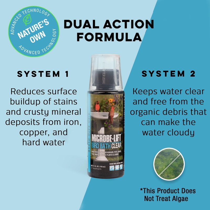 - KEEPS BIRDBATH WATER CLEAN & CLEAR: Microbe-Lift Bird Bath Clear is an easy-to-use treatment to create a cleaner birdbath in your garden, backyard, or on your patio; Bird Bath Clear uses two unique proprietary technologies for cleaner surfaces and water