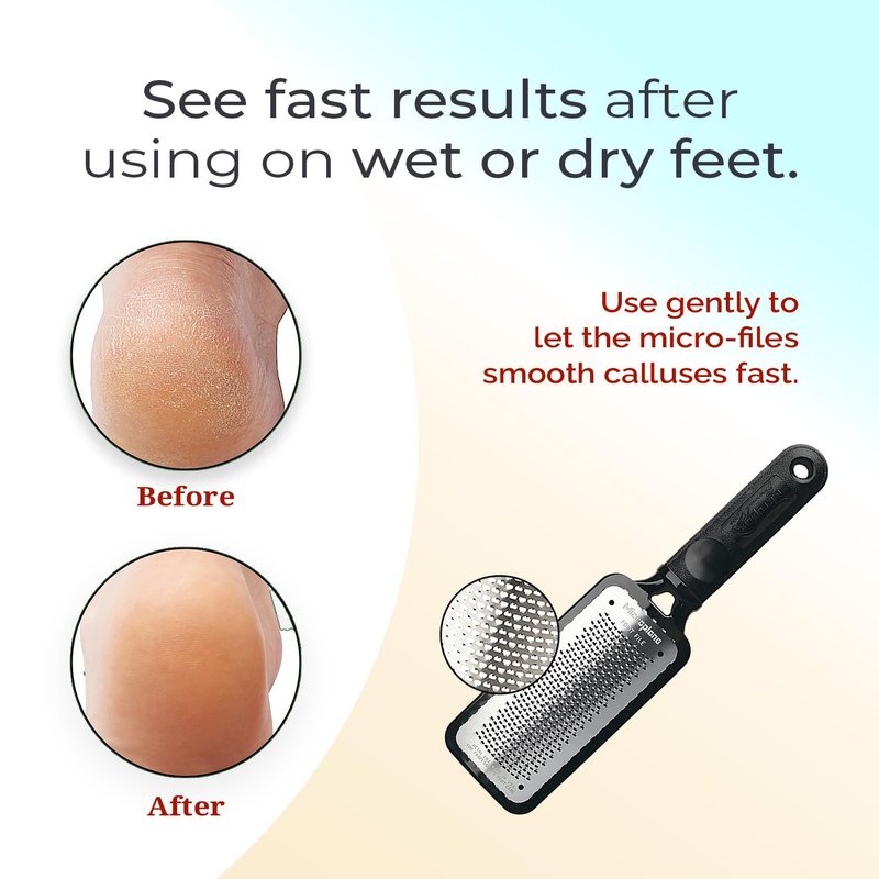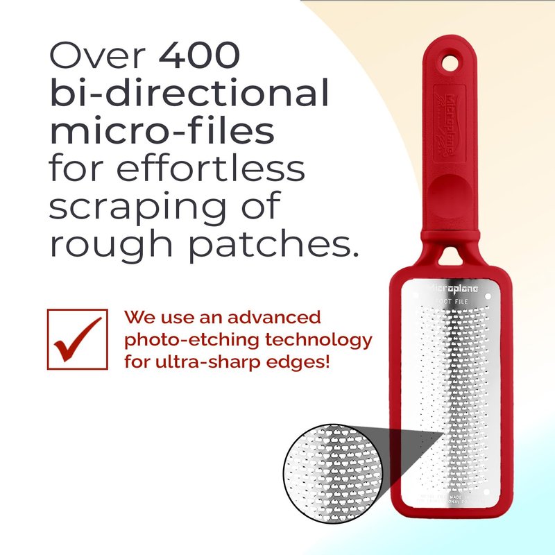 - FOOT RASP FOR WET OR DRY FEET: The original stainless-steel Colossal Microplane Foot File is a salon-quality pedicure foot file that helps you easily achieve soft, smooth feet. The surgical-grade filing surface is proudly made in the USA.