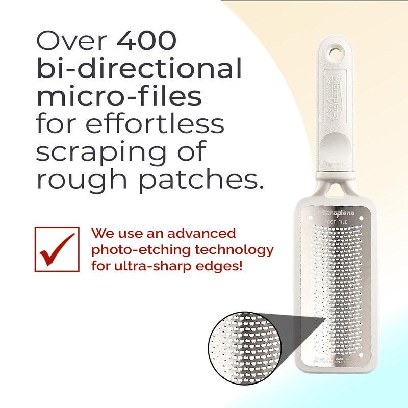 - SHOWER FOOT SCRUBBER OR DRY FOOT SCRAPER: The original stainless-steel Colossal Microplane foot file, proudly made in the USA, is a salon-quality pedicure foot file that helps you achieve soft, smooth feet naturally β either after soaking in water or while dry.