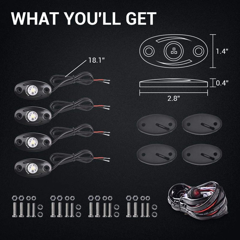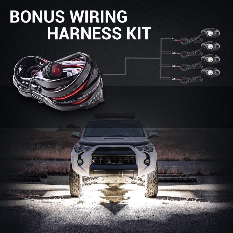 - What You'll Get - Package includes LED Rock Lights 4 Pods, Bonus Wiring Harness. Professional installation recommended, pls find professional person to wiring the light