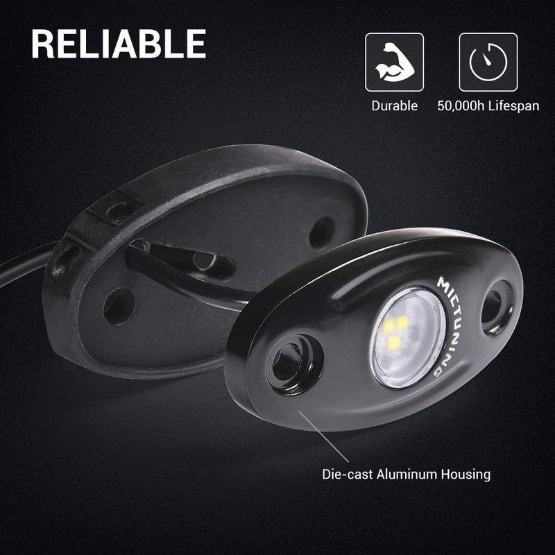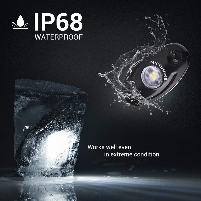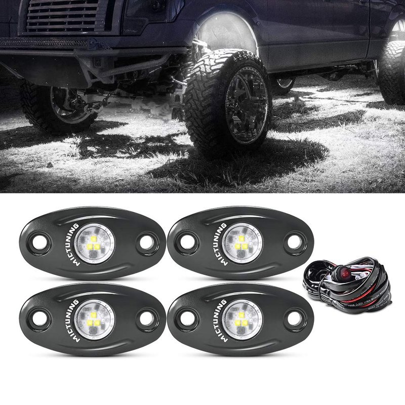 MICTUNING LED Rock Lights 4 Pods output pure white to enhance and customize your night driving experience.