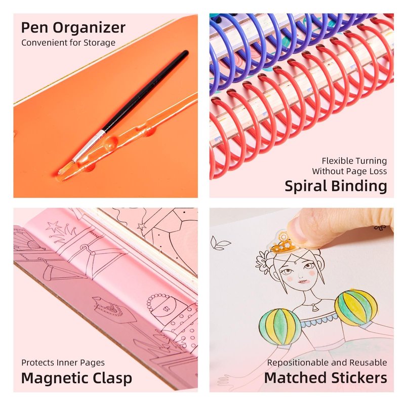 - 【Multifaceted Fun】The watercolor paint coloring book comes with watercolor paints, stickers,fabric and stencils. Encourage creativity through makeup, coloring, sticker dress-up, clothing design, and hands-on collage activities.