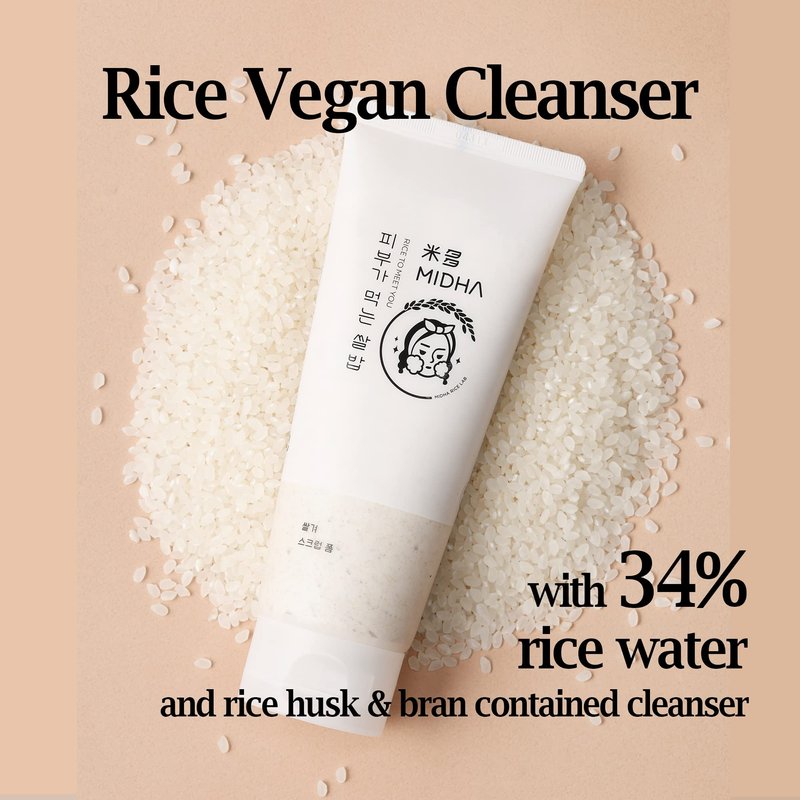 MIDHA's Rice Bran Scrub foam removes old dead skin cells with finely grinded natural rice husks instead of micro plastics. Mild daily facial wash