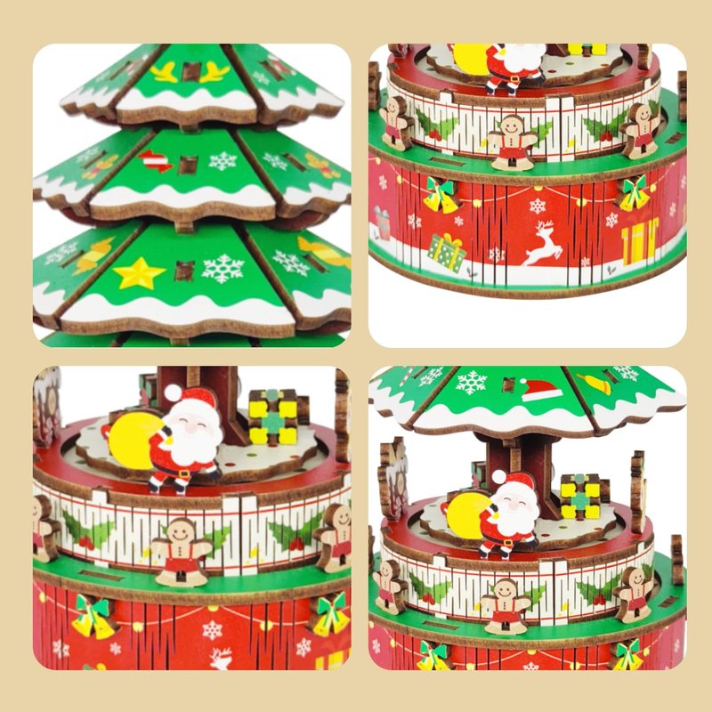 圣诞树音乐盒,碎片组成立体拼图,拼装完成后转动底部机械发条,圣诞树、圣诞老人、开始随着音乐旋转。